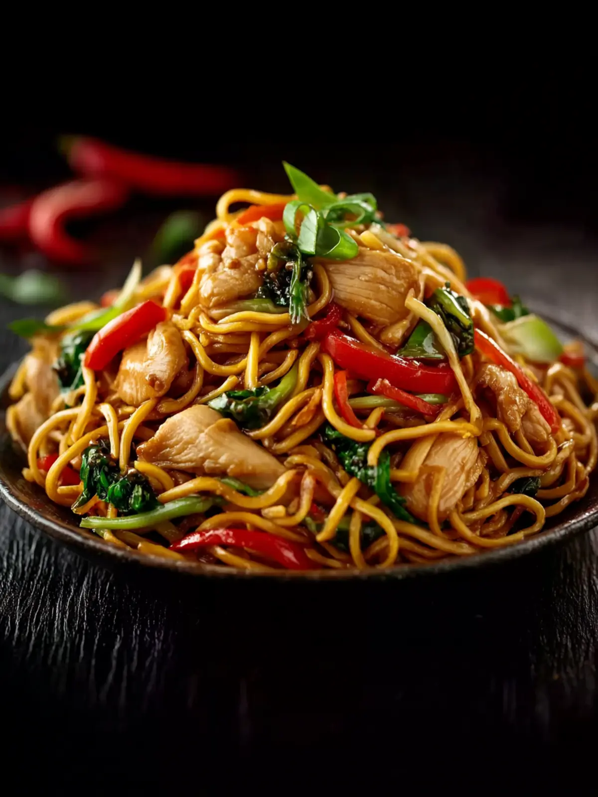 A colorful mix of vegetables like bell peppers, carrots, and bean sprouts are key to a vibrant Chicken Chow Mein. Crisp, fresh veggies not only enhance the flavor but also add a satisfying crunch.