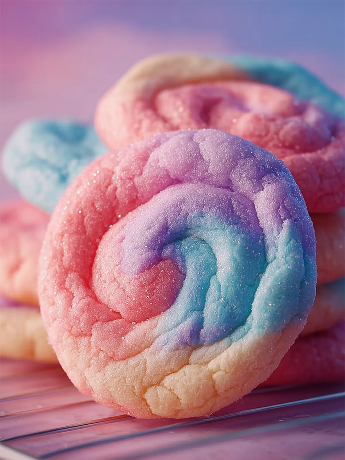 Finally, a splash of color with gel food coloring—pink, blue, and purple—creates a cheerful swirl that visually mimics the cotton candy experience, making these cookies not just tasty but a feast for the eyes!