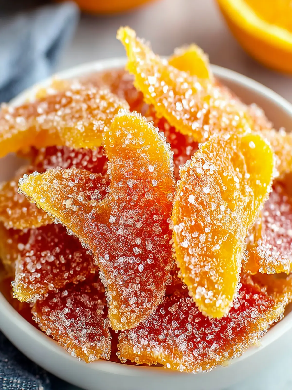 Deliciously sweet and tangy candied orange peels, perfect for snacking or as a garnish.