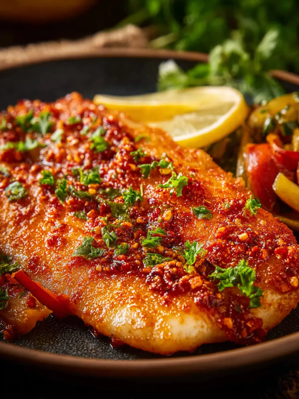 Deliciously baked basa fillets marinated in a spicy chili sauce, perfect for serving with grilled vegetables or salad.